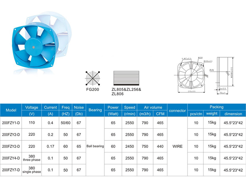 機框:鑄造合金鋁 風(fēng)葉:PBT塑料 絕緣度:在引線與機框之間直流500V電壓時10兆歐 耐壓:交流1500V/50-60Hz 持續(xù)1分鐘,漏電源小于5毫安 工作溫度:-20℃~80℃ 工作濕度:20%~85% 工作電壓:AC110V的電壓范圍是85V~125V,220V的電壓范圍是190V~250V。
