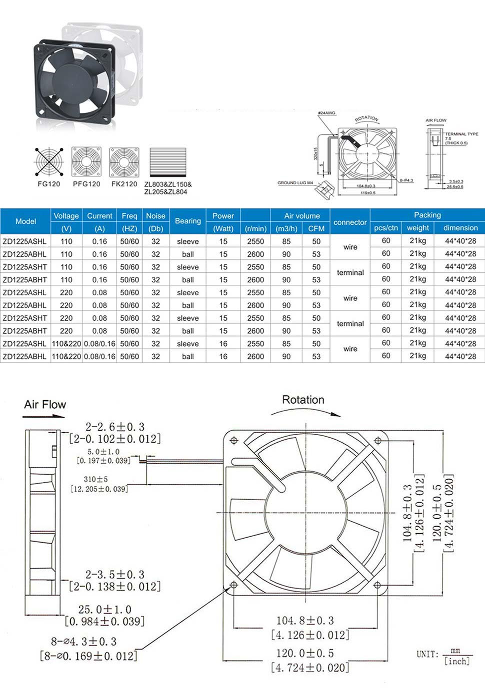 機框:鑄造合金鋁 風葉:PBT塑料 絕緣度:在引線與機框之間直流500V電壓時10兆歐 耐壓:交流1500V/50-60Hz 持續(xù)1分鐘,漏電源小于5毫安 工作溫度:-20℃~80℃ 工作濕度:20%~85% 工作電壓:AC110V的電壓范圍是85V~125V,220V的電壓范圍是190V~250V。